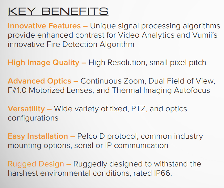 Sii cameras have the widest variety of lens options on the market and can be configured with IP video and control, with Vumii’s innovative Fire Detection Algorithm, or integrated with a pan/tilt unit.